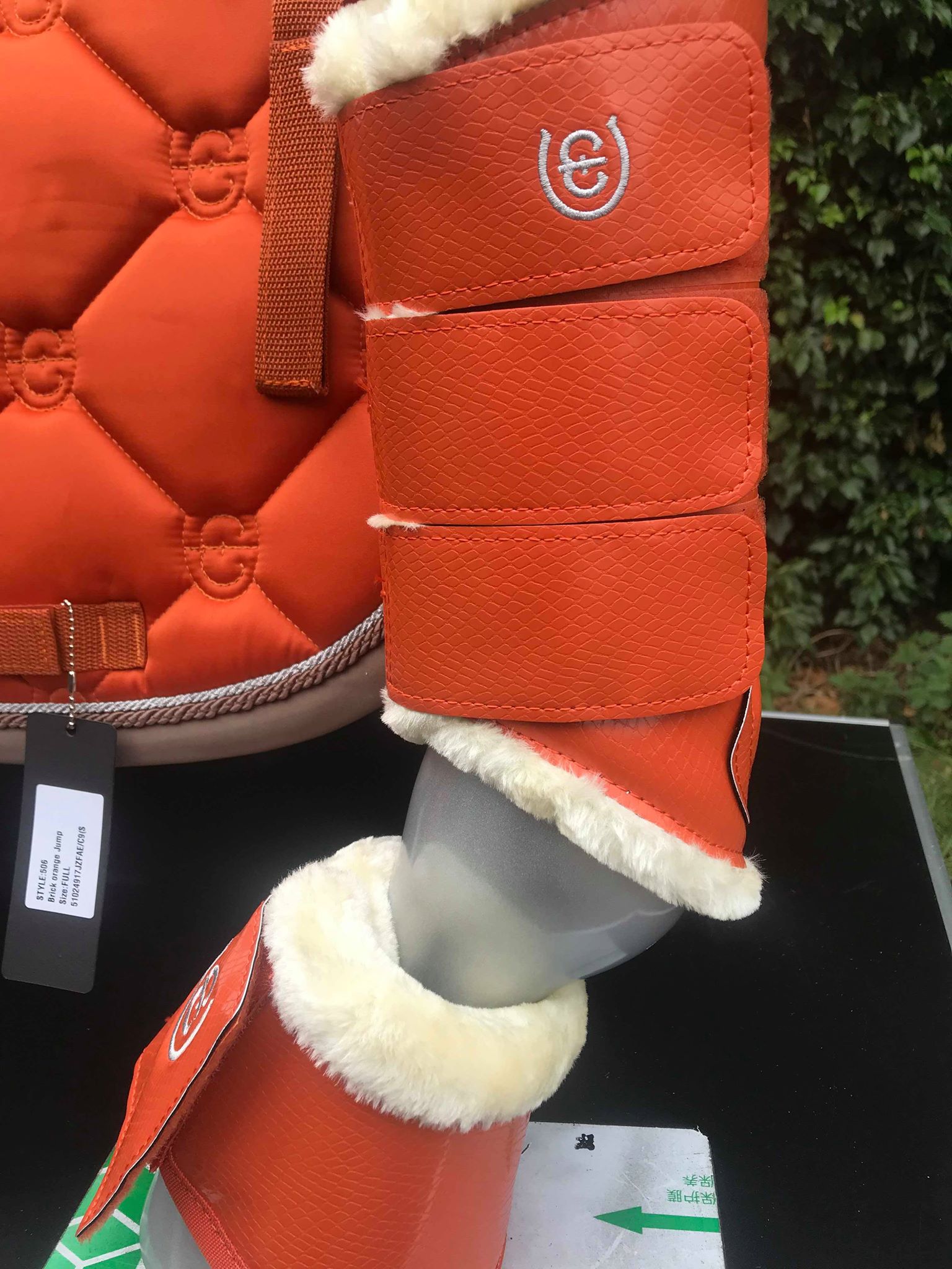 The Brick Orange features a Champagne Binding and piping on the saddle pad and a majority Champagne ear bonnet. There is also a silver piping and logo. This colour may not be for everyone, but I’m totally in love. It looks beautiful on a grey, and for bright colour lovers, this is definitely for you. The new boots are also available in this colour with silver logo.