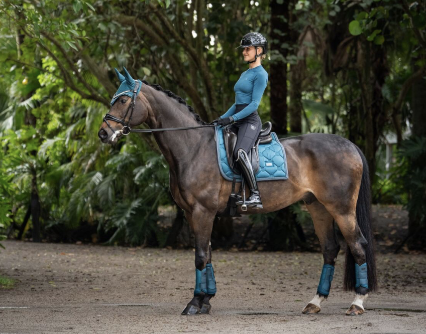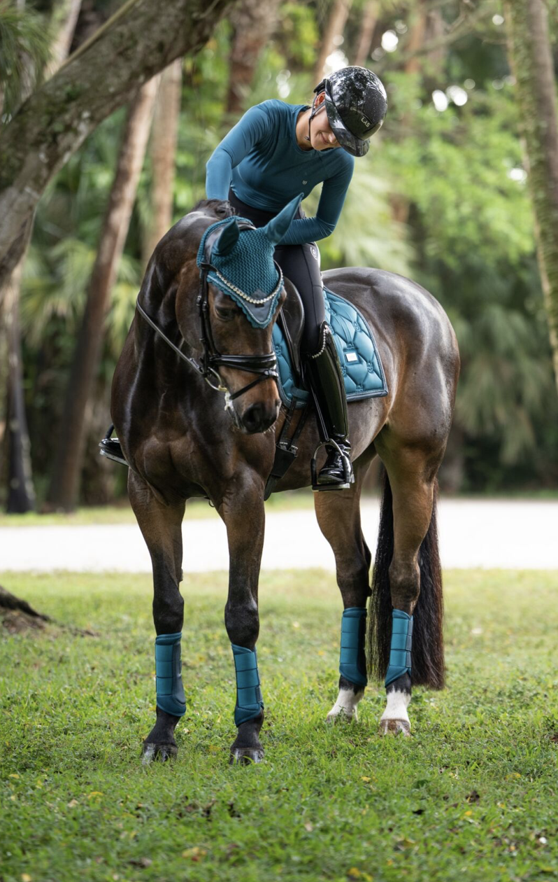 Elegant saddle pad in a cold deep blue with silver details. Decorated with the Equestrian Stockholm badge in black. The material is treated with High IQ cool comfort which gives the saddle pad quick dry and moisture wicking abilities. This helps your horse stay dry and fresh longer. Style with other pieces from our Teal Blue collection for a head-to-toe stylish look.