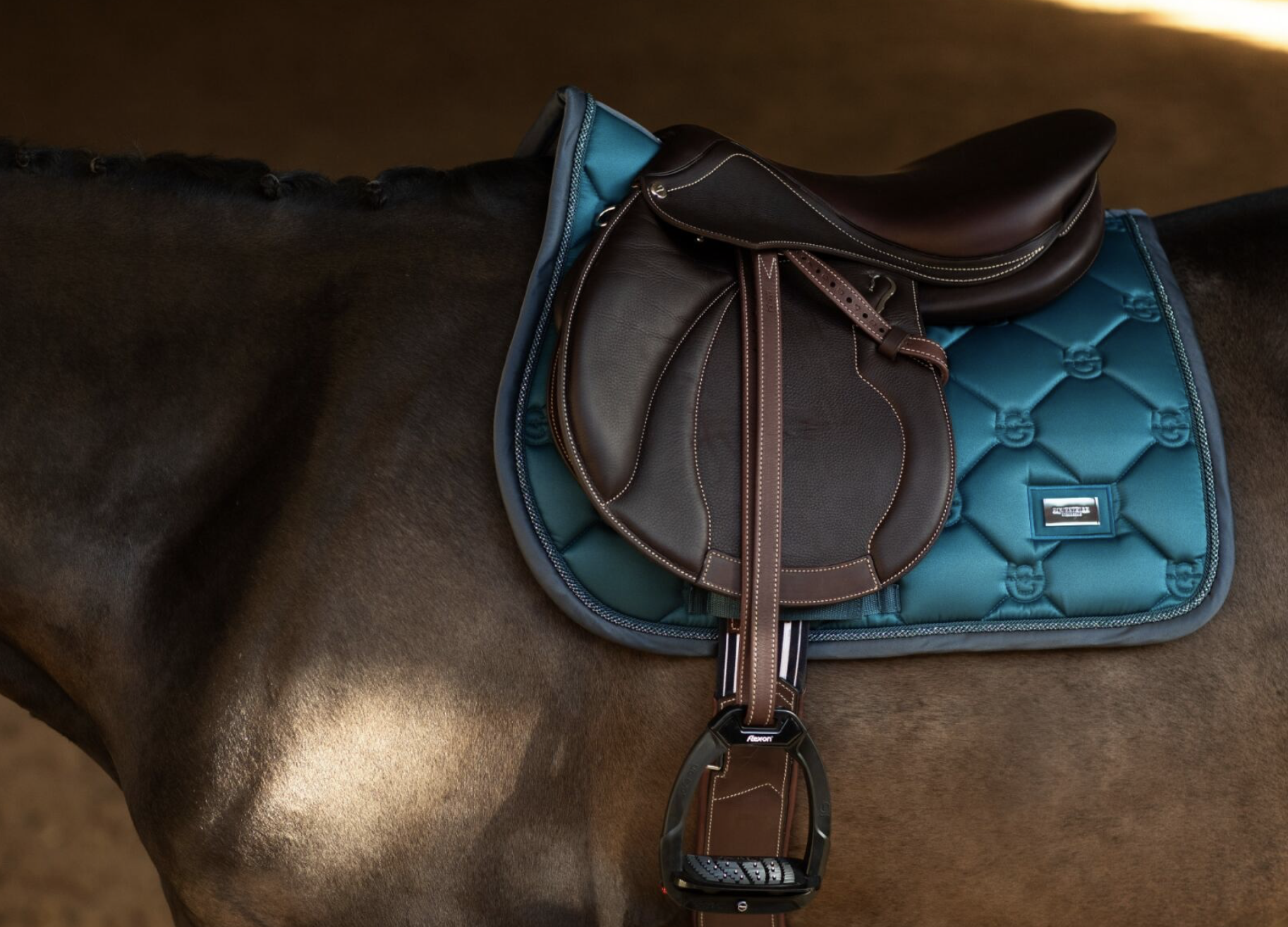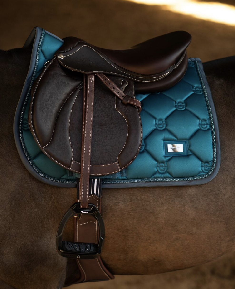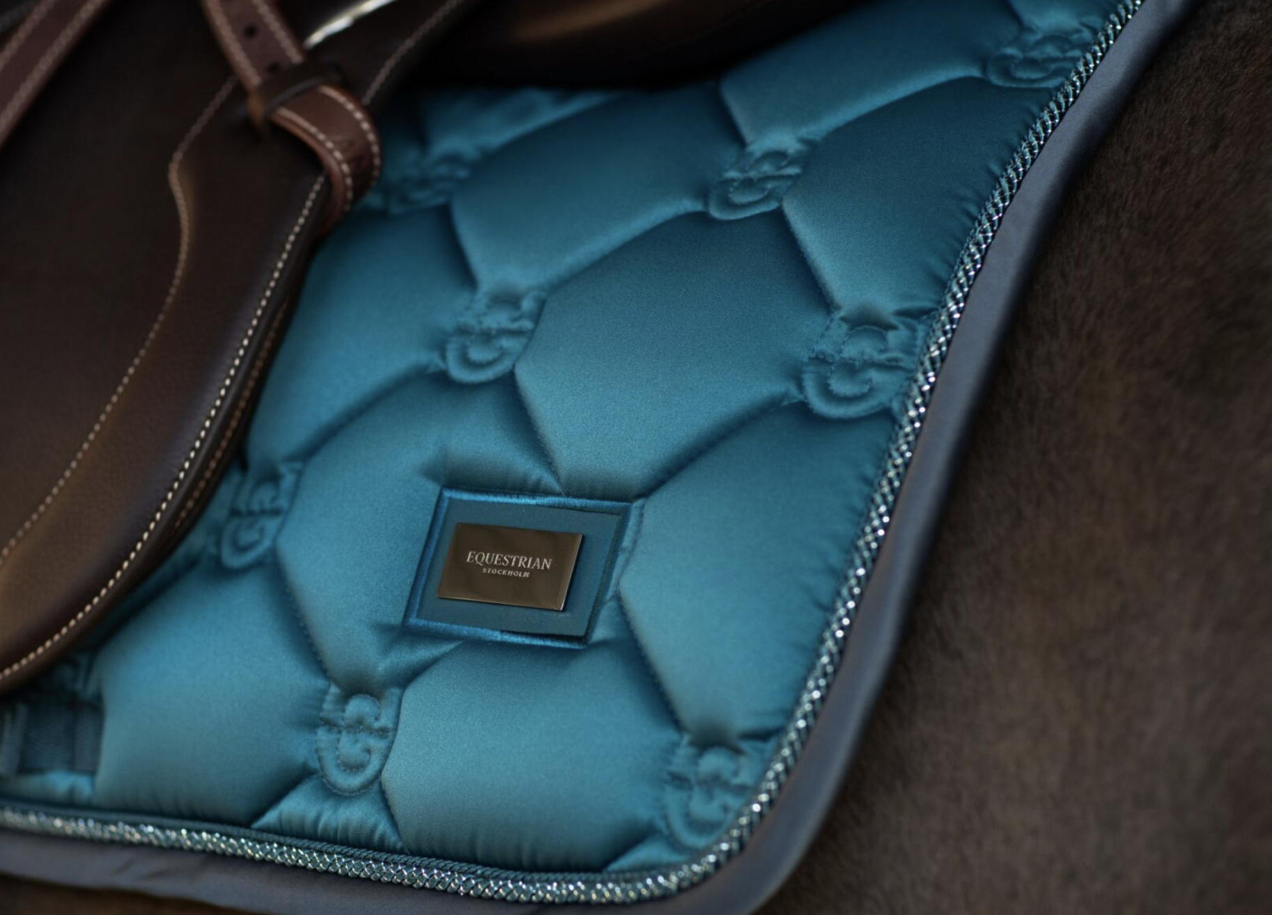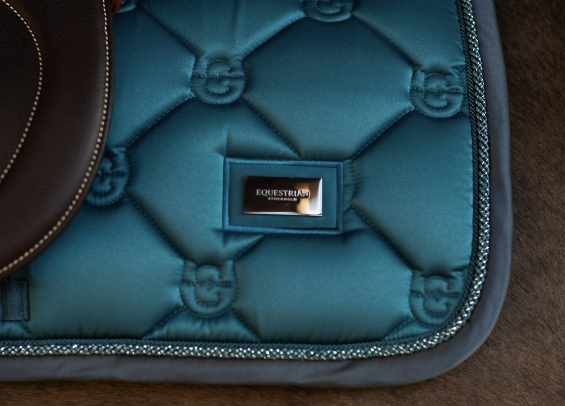 Elegant saddle pad in a cold deep blue with silver details. Decorated with the Equestrian Stockholm badge in black. The material is treated with High IQ cool comfort which gives the saddle pad quick dry and moisture wicking abilities. This helps your horse stay dry and fresh longer. Style with other pieces from our Teal Blue collection for a head-to-toe stylish look.
