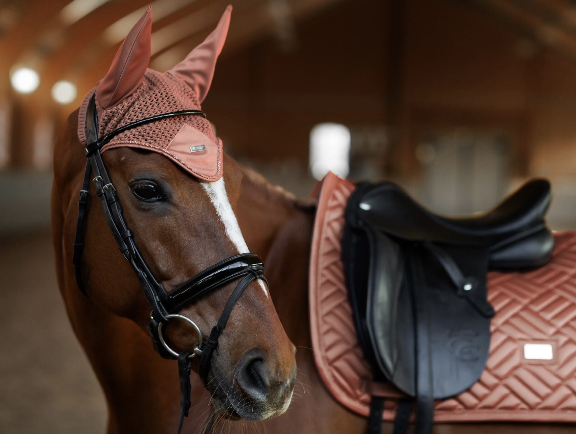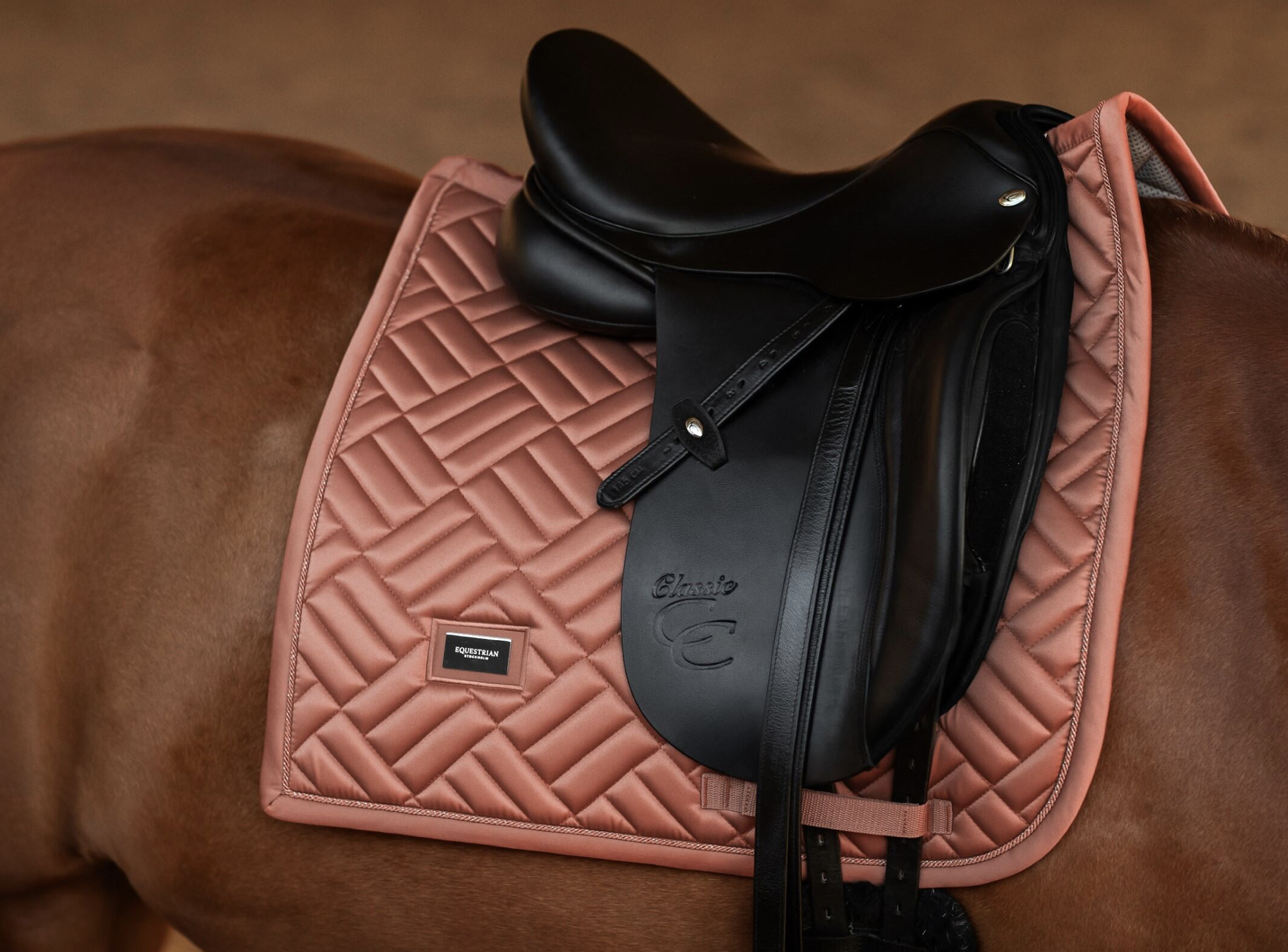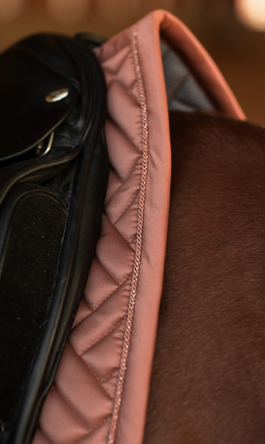 Elegant saddle pad with modern quilting in coral pink with silver details. Decorated with the Equestrian Stockholm badge in silver. The bamboo material is perfect all year round due to its thermal regulating effect – cooling in the summer and warming in the winter. It is also quick dry, moisture wicking, and anti-bacterial. Style with other pieces from the Coral collection for a head-to-toe stylish look.