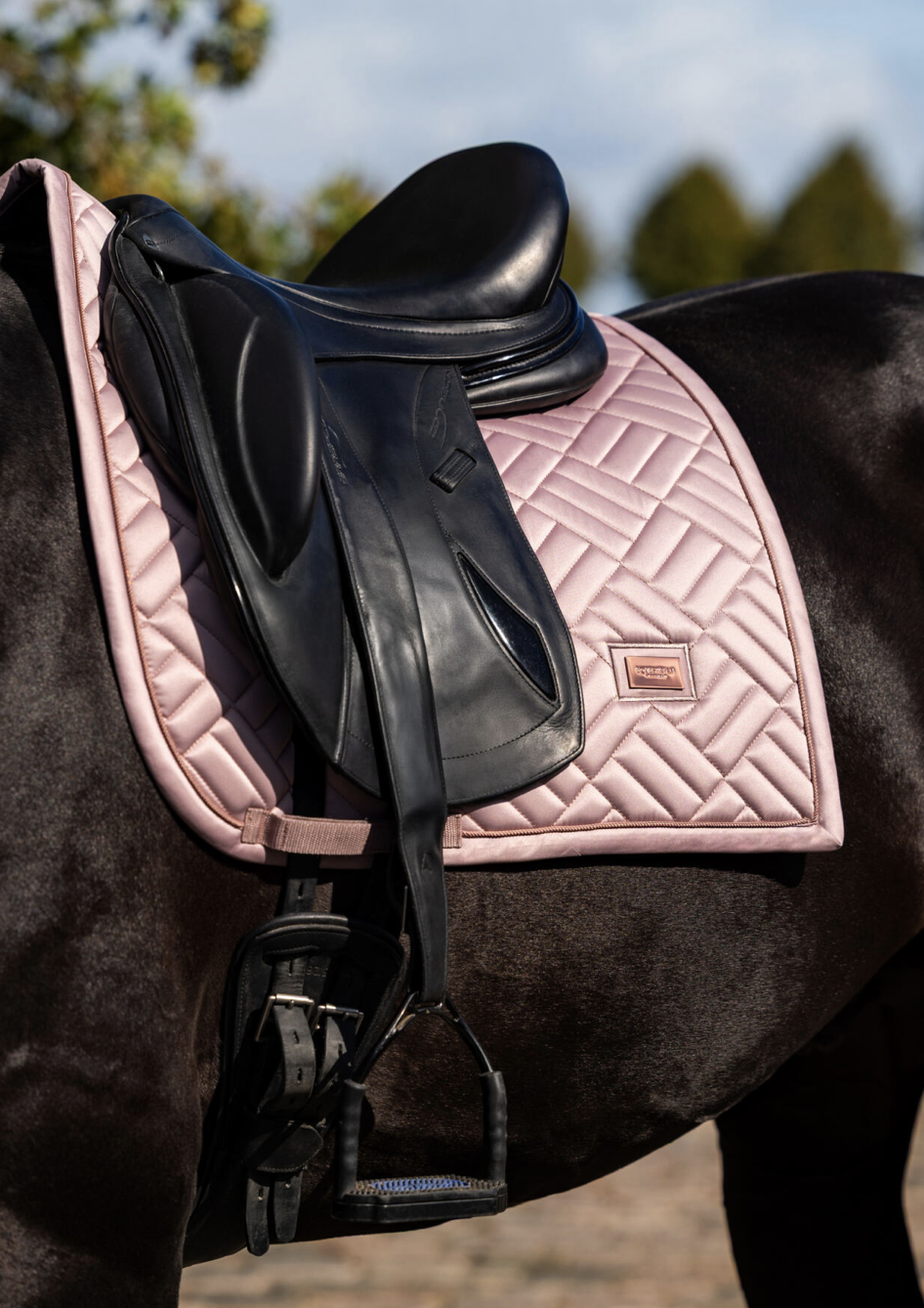 Elegant saddle pad with modern quilting in blush pink with rose gold details. Decorated with the Equestrian Stockholm badge in rose gold. The bamboo material is perfect all year round due to its thermal regulating effect – cooling in the summer and warming in the winter. It is also quick dry, moisture wicking, and anti-bacterial.