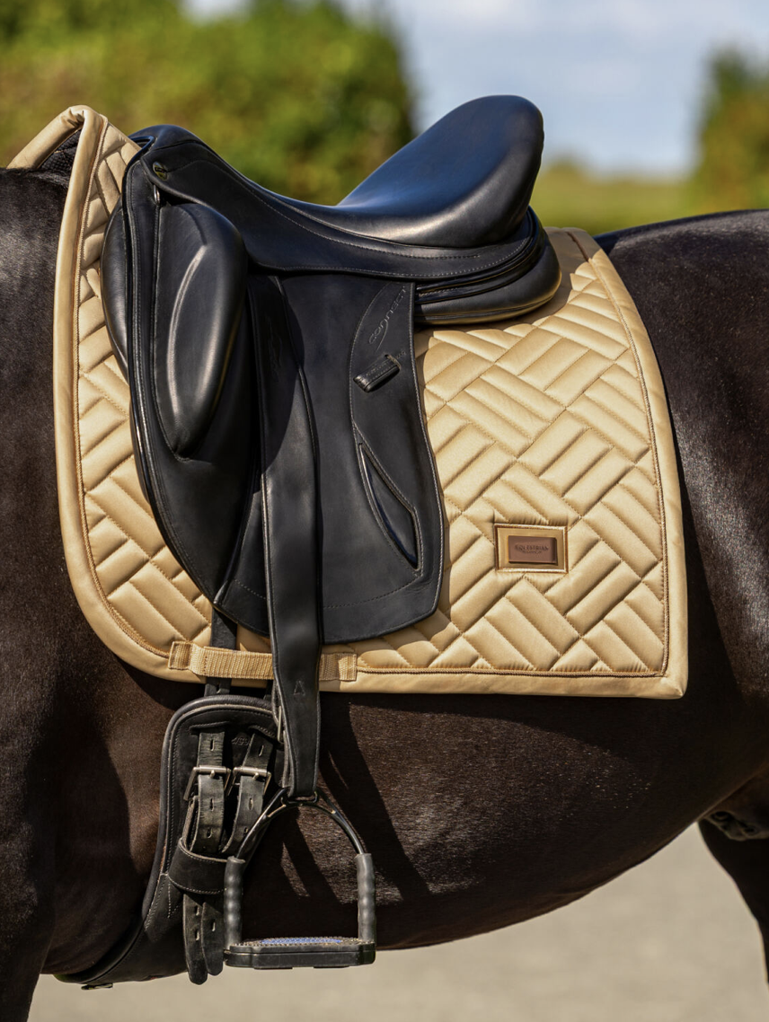 Elegant saddle pad with modern quilting in mustard yellow with rose gold details. Decorated with the Equestrian Stockholm badge in rose gold. The bamboo material is perfect all year round due to its thermal regulating effect – cooling in the summer and warming in the winter. It is also quick dry, moisture wicking, and anti-bacterial.