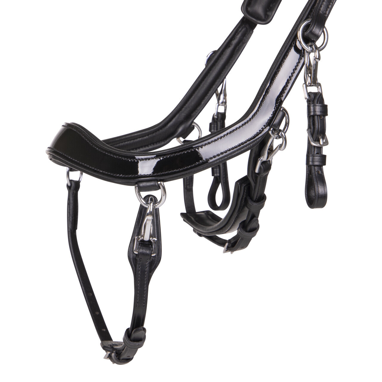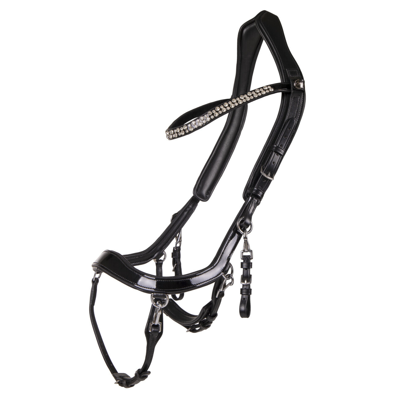 - The bridle is finished with a patent leather noseband and has a browband with rhinestones