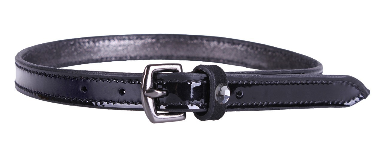 Black patent leather spur straps with silver coloured stainless steel buckle. Finished with suedine slider with grey rhinestone.