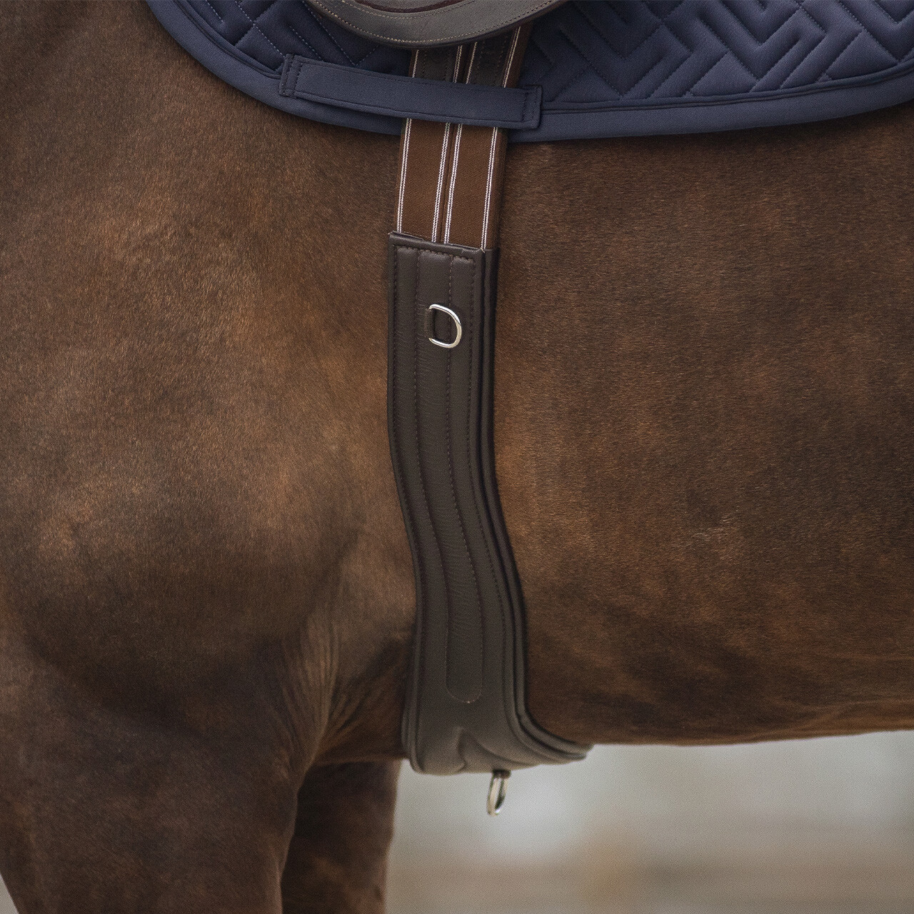 - The elastic of the dressage girth is concealed under the leather, serving as a checkpoint for a snug girth. When the elastic becomes more visible to the rider, there is no need to tighten further; the horse still has enough breathing room.