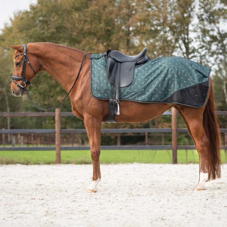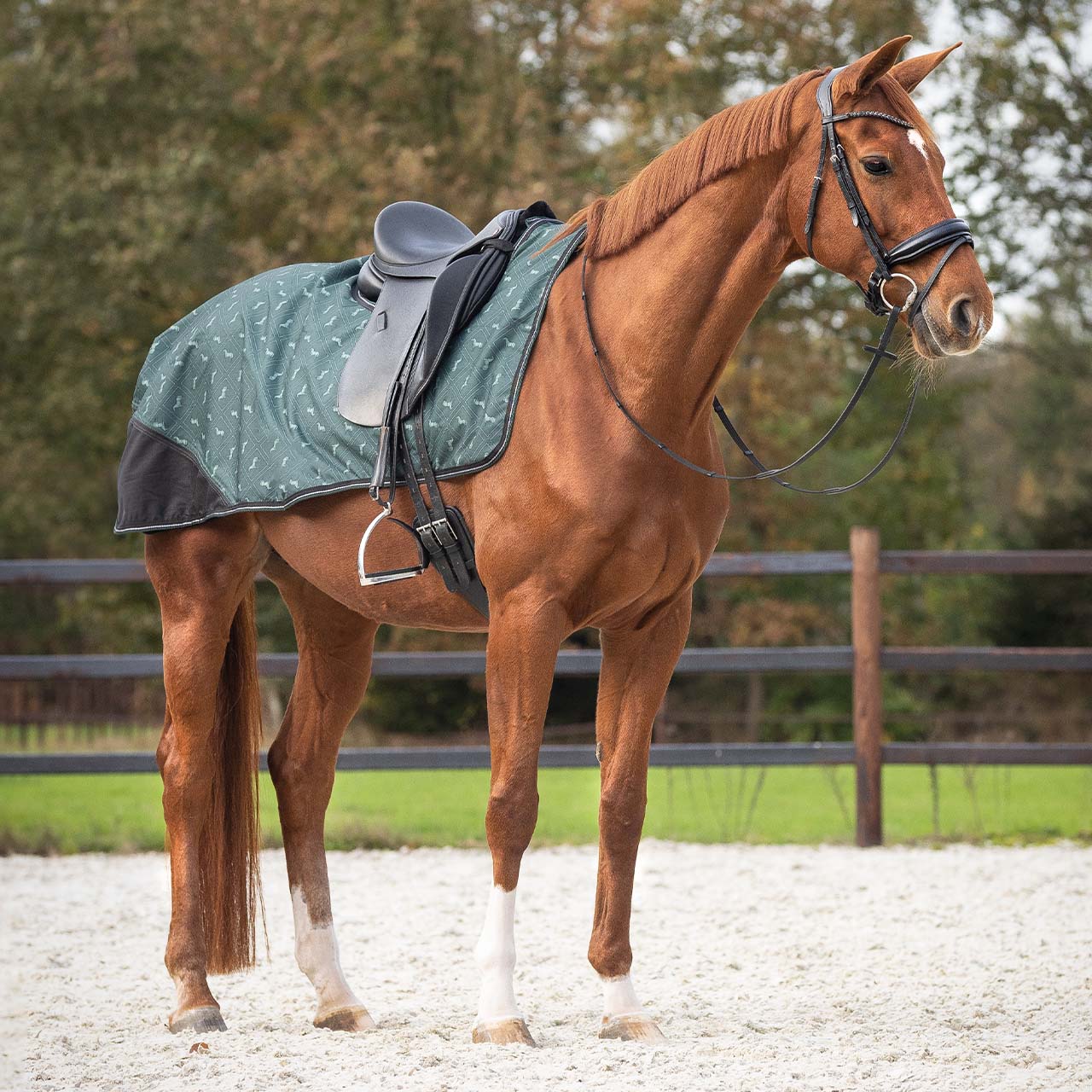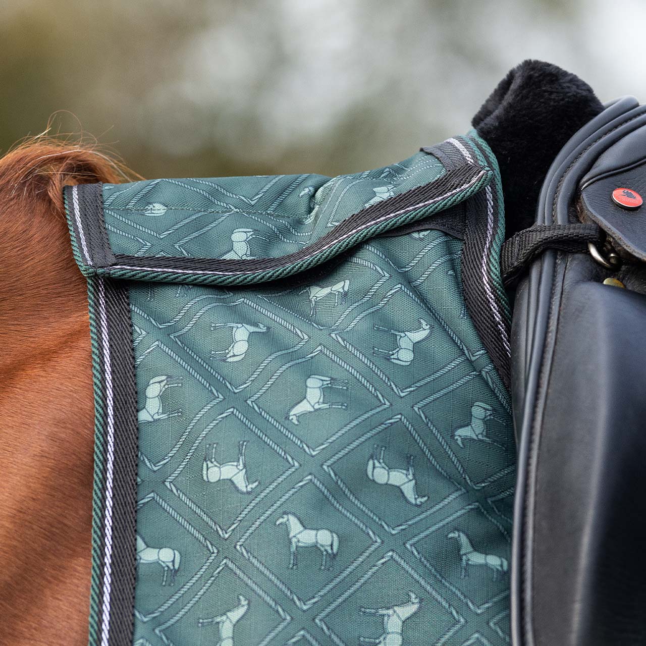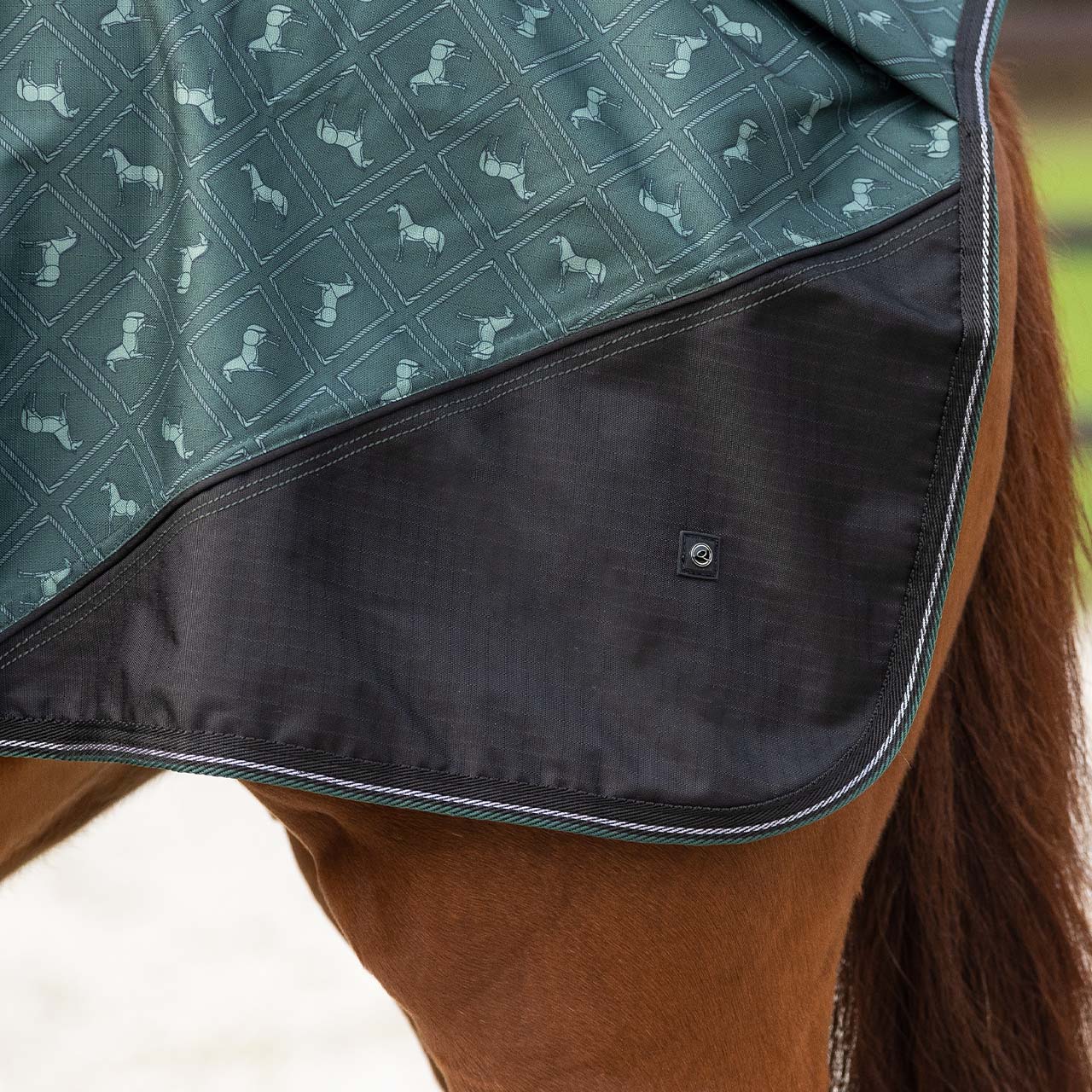 The rug is fastened with a hook-and-loop fastener on the withers.