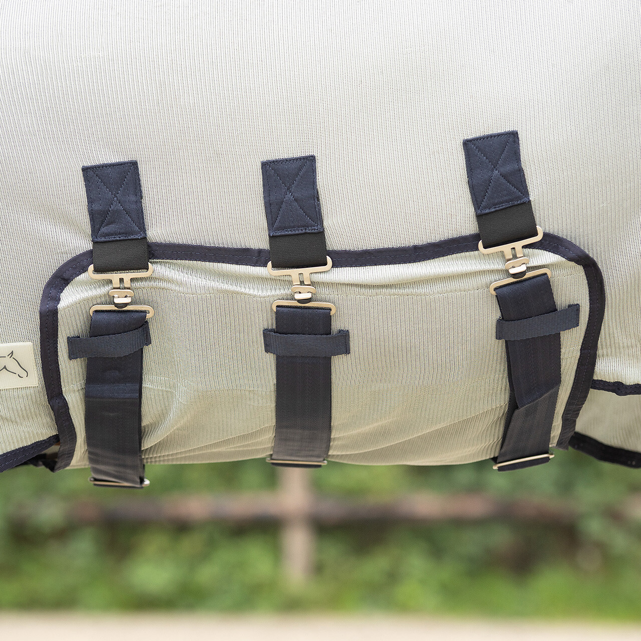 This rug has a detachable neck and hood, which can be taken off when flies and other insects are less active. The rug has a belly flap which fits nicely around the belly and is attached twice with a Hook-and-loop fastener and surcingles which prevents it from shifting.