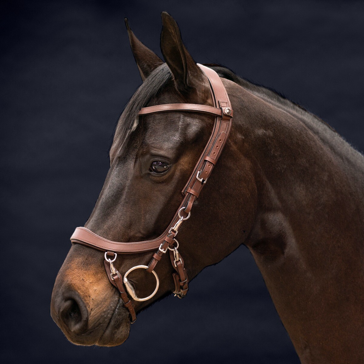 The rings to which the cheek pieces are connected feature an elastic insert. This creates an elastic connection which prevents excessive pressure on the connection between the mouth and crown piece. It can also contributes a still location of the bit in the mouth.