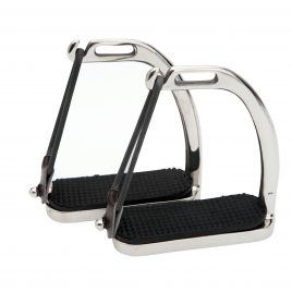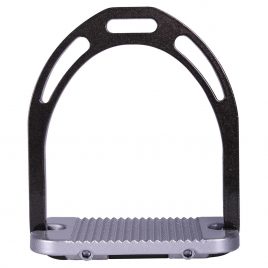 These high performing stirrups feature a mobile silicone arm which is securely engaged at the top into a built-in pin on the fixed gullet, which releases under pressure during a fall. The lower section of this silicone arm is set between the stirrup tread and gullet. which is designed to prevent it from loosening under conditions of normal use, but in case of a fall, it can be easily extracted.