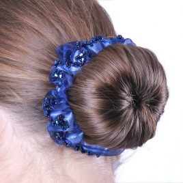 Elastic hair scrunchie with beads strung to sturdy elastic. The scrunchie is finished with small rhinestones on the beads for an extra chic look.